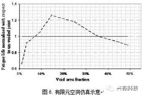 一般来说,空洞的位置和尺寸是影响产品性能与焊接可靠性的两个关键因素。有研究显示,空洞距离焊接界面越近(尤其位于焊接界面上的空洞),对焊点的机械性能(如焊点开裂)影响越大,并顺利获得仿真计算发现,空洞面积小于15%时,热机械性能持久性随空洞面积的增大而增长;空洞面积大于15%时,则随空洞面积的增大而减小。如下图: