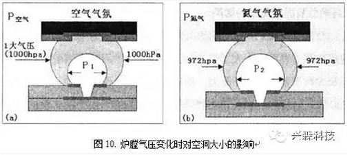 根据阿伏伽德罗定律,同温同压时相同体积含有的分子数相同。常态下空气大致是由N2(80%)+ O2(20%)组成,当再流焊接炉膛内的空气被纯N2气氛所置换时,则再流焊接炉腔内的气压也必然要发生某种变化,这种变化应该是导致BGA焊球内空气体积扩张行为的驱动力。有研究表明,当炉膛内由空气改成N2后,炉膛内气压下降了2.8%,即假定空气时气压为1bar,换成N2后,炉膛内气压降低了28hpa,故为保持空洞内气压与炉膛内气压的平衡,就只有增大空洞的体积予以实现(图10所示)。