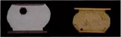 另一种情形是BGA焊盘设计过孔(或盲孔)时,也可能出现与盲孔直接相连接的空洞(本质上属于PCB侧界面空洞的一种),如图9。因此,BGA焊盘上盲孔最好最塞孔(填孔)处理,且将其设计在焊盘下面(如PCB制作中的树脂塞孔工艺)。