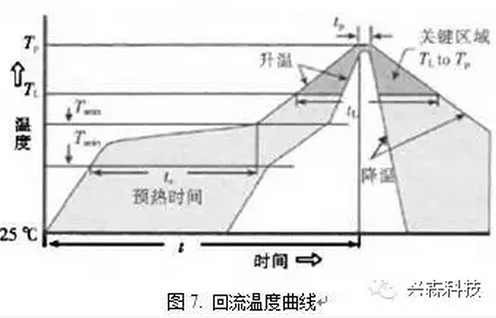 如图7,回流焊温度曲线一般可分成预热、保温、回流、冷却四段,各段温度曲线需要综合考虑助焊剂、PCB材料、器件属性(有铅还是无铅)以及器件布局等因素来确定。