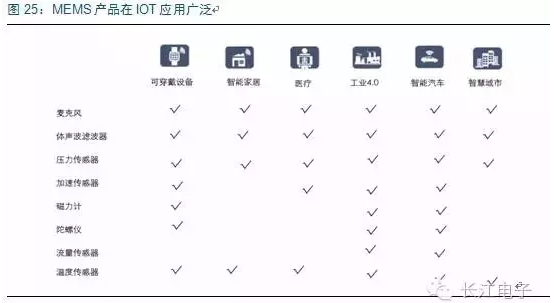 MEMS技术在可穿戴设备、智能家居、医疗、工业4.0、智能汽车、智慧城市等IOT细分领域都有广泛的应用,常见的MEMS传感器诸如麦克风、体声波滤波器、压力传感器、温度传感器等都存在丰富的应用场景。