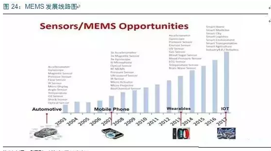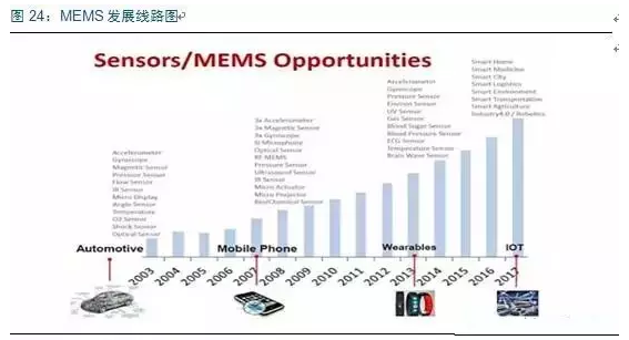 MEMS的传感器开展共经历了三个阶段,分别对应不同的驱动力。2000年左右是汽车电子、2007年左右是智能手机、2013年左右是可穿戴设备,下一个驱动MEMS的传感器开展的动力是物联网,业界预测全球传感器需求有望从当前的百亿级激增到2025年的Trillion-Sensor(TSensor,万亿-传感器)量级。