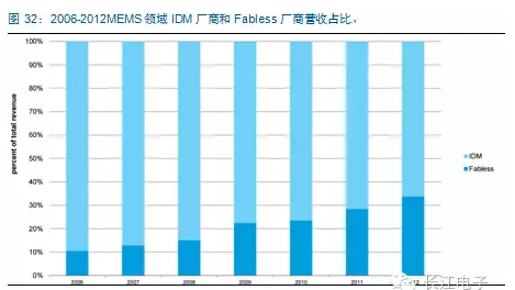 MEMS行业中Fabless的份额由2006年的10%增加到2012年的32%左右,正如集成电路行业所经历由的一样,行业细化和分工的趋势不可逆转。MEMS传感器行业的品种多达上万种,单品种的销量很难放大,在价格不断走低的情况下,企业很难盈利,无法承受大规模的资本支出。面对不断增长的市场规模,迫切想进入的中小设计厂商有很强的代工需求,Fabless存在的价值日益凸显。除此之外,由于市场规模相对过小,缺乏统一工艺,传统的集成电路代工厂商如台积电, 联电, 中芯国际等一线代工厂商较之新进入的MEMS代工企业赛莱克斯和Tronics、IMT并无绝对的优势,这就给专注于MEMS代工厂商留下了更大的开展空间。
