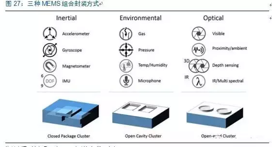 MEMS产业正向多传感器集成方向前进,形成三大类组合传感器,体积更小、重量更轻、功能集成度更高的组合MEMS传感器是开展方向。