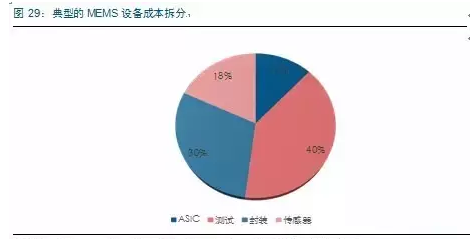 不同于传统的集成电路产业链,MEMS中封装和测试占据了产业链70%的成本,根据典型的MEMS设备成本拆分,其中ASIC占据了12%,测试占据了40%,封装占据了30%,传感器占据了18%,因此封装和测试显得尤为重要。MEMS的器件复杂性导致了封装成本过高,同时测试效率低,尤其是做生物MEMS、化学MEMS,其测试效率更低,这也是制约MEMS封测开展的瓶颈,因此批量自动化封装及测试能力是降低成本获取市场的关键,拥有核心封测技术的厂商将深度受益。