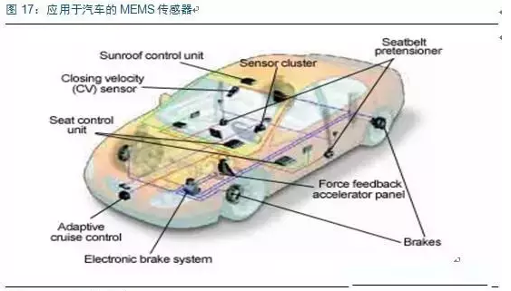 MEMS传感器:硅麦克风、陀螺仪、加速度器、磁力计、组合传感器、压力传感器、轮胎压力传感系统等。