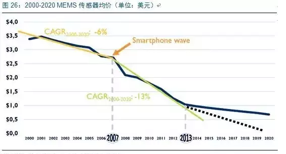 2001-2007年间,MEMS传感器均价由3.5美元降低到接近2.7美元,CAGR为-6%;2007-2013年间,MEMS传感器均价由接近2.7美元降低到1美元,CAGR为-13%。过去五年MEMS市场参与者不断增加,尤其移动端货量急剧增长,给价格带来了较大的压力,市场有内在出清的需求。