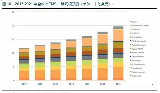 过去几年,以智能手机为代表的消费电子产品大幅拉升MEMS器件的出货量,随着智能手机/便携式应用市场已经接近饱和,MEMS市场增速比前几年有所放缓。Yole Development预计2015~2021年全球MEMS市场的复合年增长率(CAGR)为8.9%,将从119亿美元增长到200亿美元,同期全球MEMS出货量的复合年增长率为13%。