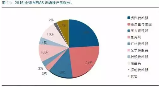 预计2016年,MEMS按产品线划分占主导低位的依然是惯性传感器和微流量传感器,占比都为24%左右,其次是压力传感器,占比为13%,光学传感器和喷墨头,占比都为10%左右。