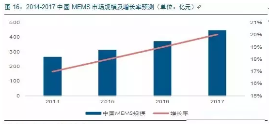据赛迪顾问的研究数据,2014年中国MEMS器件市场规模为265亿元人民币,占据全球市场的三分之一。从开展速度而言,中国MEMS市场增速不断快于全球市场增速。2014年中国MEMS器件市场增速高达17%,中国集成电路市场增速为9%,横向对比而言,MEMS器件市场的增速两倍于集成电路市场。预计到2017年,国内MEMS市场规模将达到400-450亿元,2014-2017复合增长率为19%。在较为乐观情况下,按照赛迪的远景预测,整个中国MEMS市场有望形成接近1000亿人民币的庞大市场。