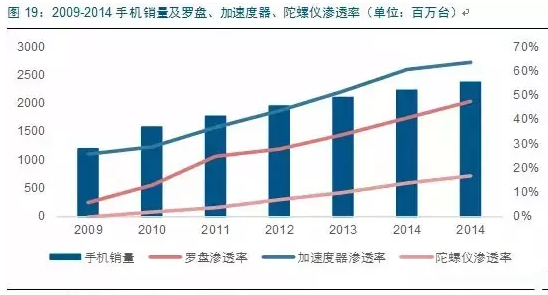截至到2014年,常见的三种用于智能手机的罗盘传感器、加速度器传感器、陀螺仪渗透率分别为48%、64%、17%,陀螺仪渗透率偏低,通常在高端机型上有配置。