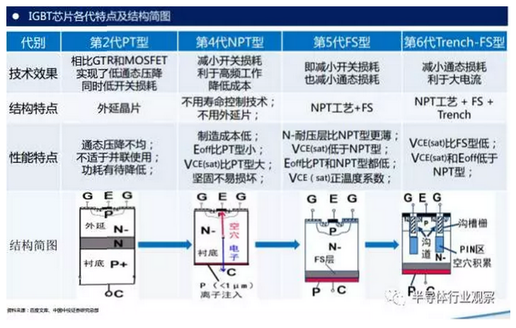 而经过这么多年的开展,我们清楚明白到,从结构上看,IGBT主要有三个开展方向,分别是IGBT纵向结构、IGBT栅极结构和IGBT硅片加工工艺。而在这三个方面的改良过程中,厂商聚焦在降低损耗和降低生产成本两个方面。